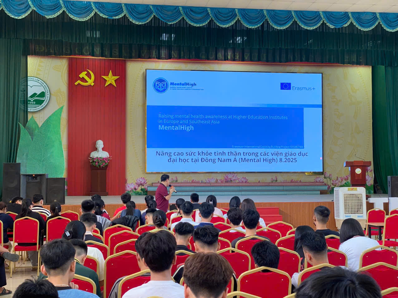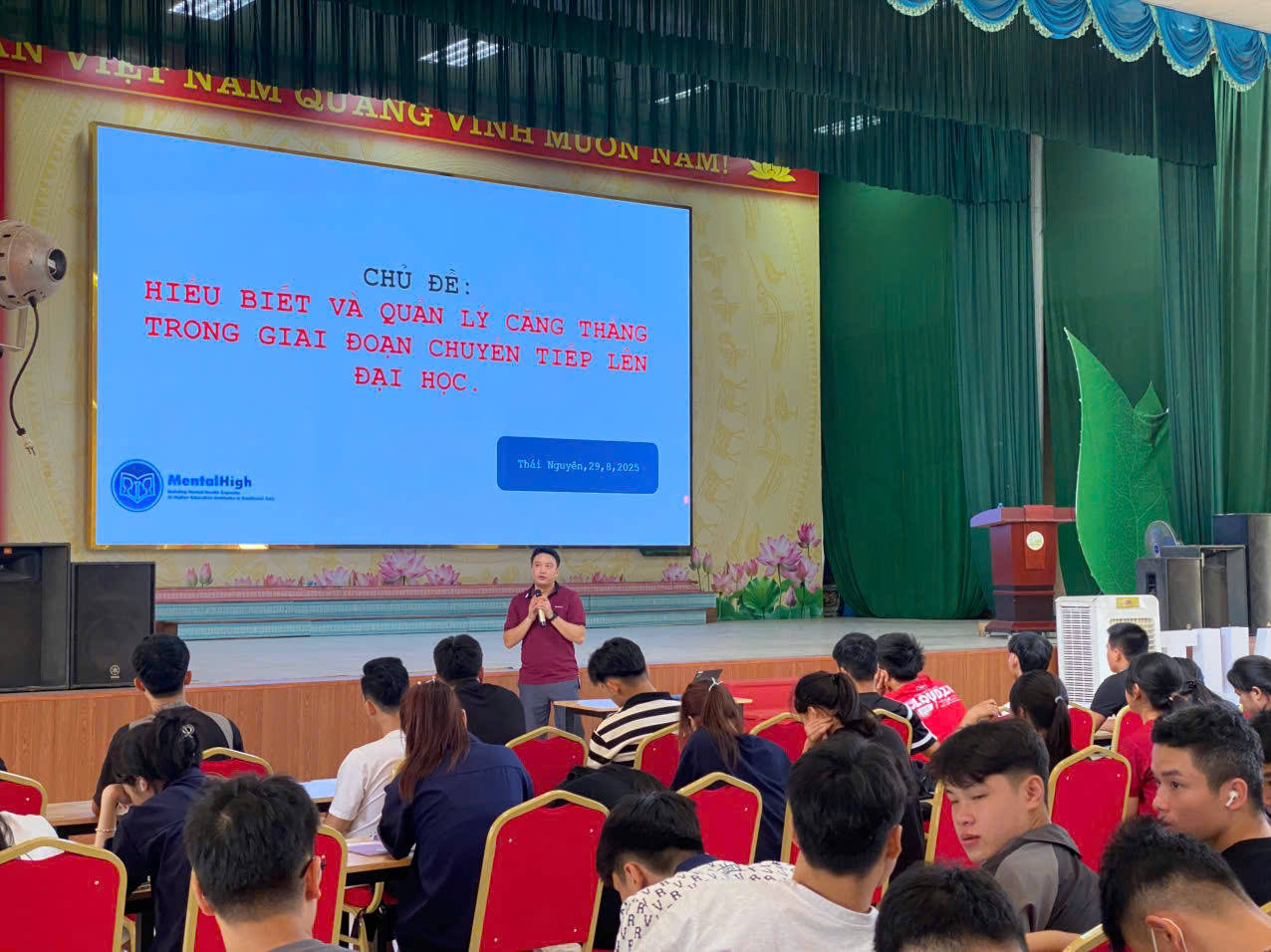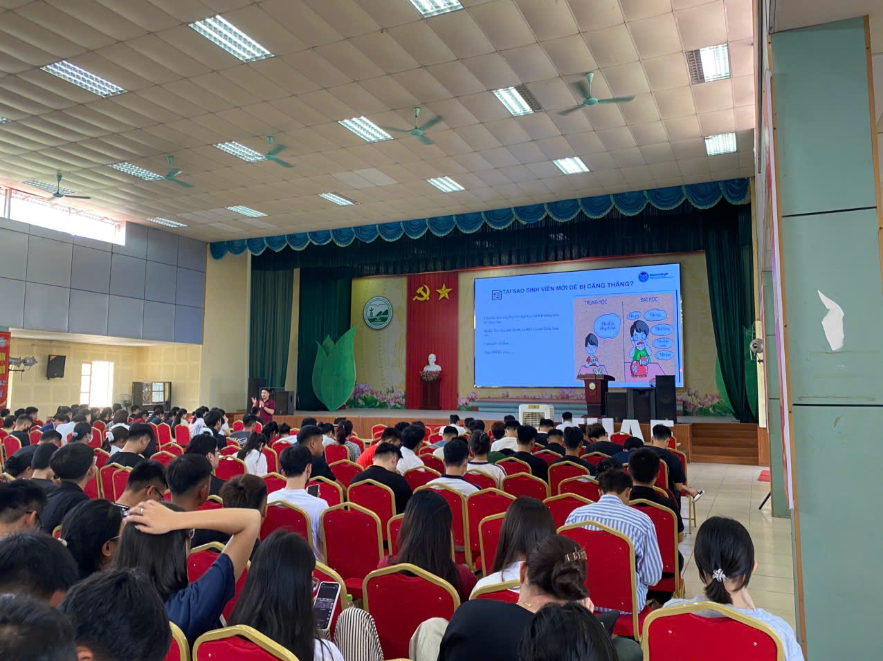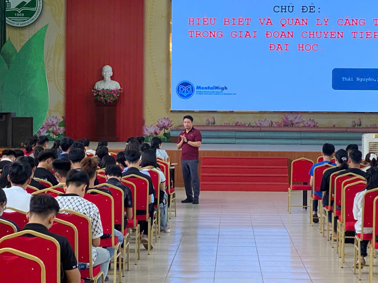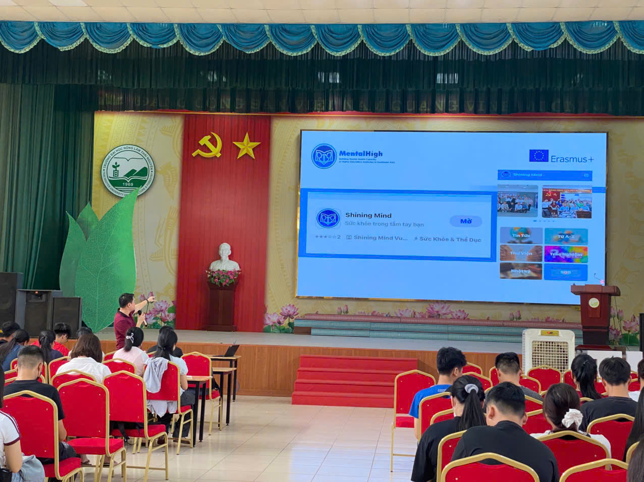 During the orientation week for new students at Thai Nguyen University of Agriculture and Forestry (TUAF), the university integrated mental health content to support students in adapting to the new academic environment. Specifically, the topic “Understanding and Managing Stress During the Transition to University” was incorporated into discussions and exchanges to help students acclimate and equip them with effective stress management skills. At the sharing session, the project management team, in collaboration with the Student Affairs Office, introduced the Mental Health Project, utilizing a mobile application alongside interactive activities such as group discussions and games. These activities were designed to enhance students’ awareness and responsibility toward their mental well-being, while providing practical tools to cope with pressures during the transition period. The program not only fostered a deeper understanding of stress but also encouraged students to develop self-care habits, contributing to their holistic development throughout their academic journey at the university.
