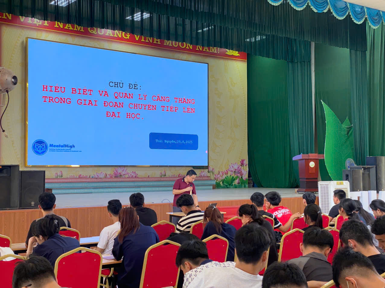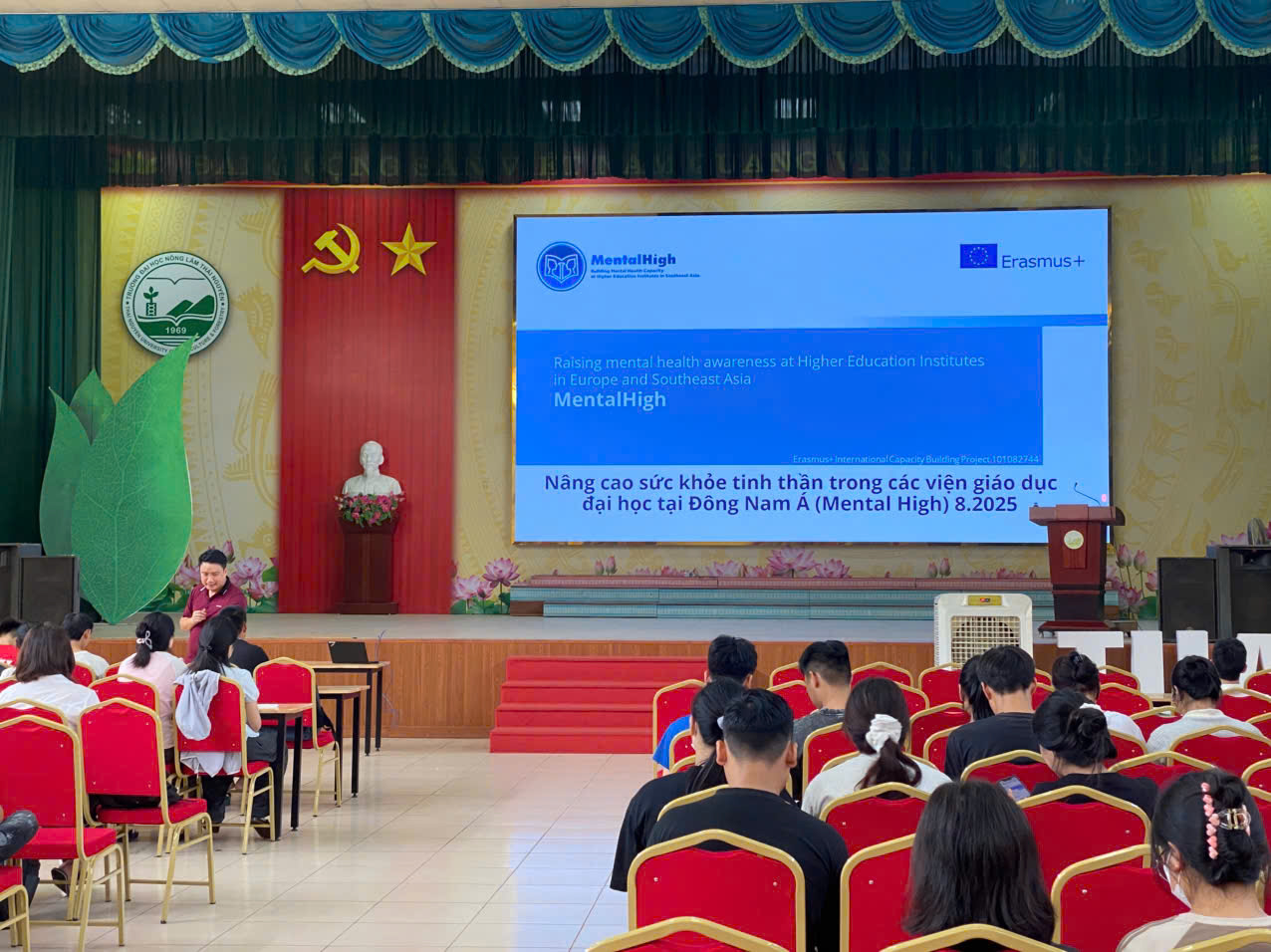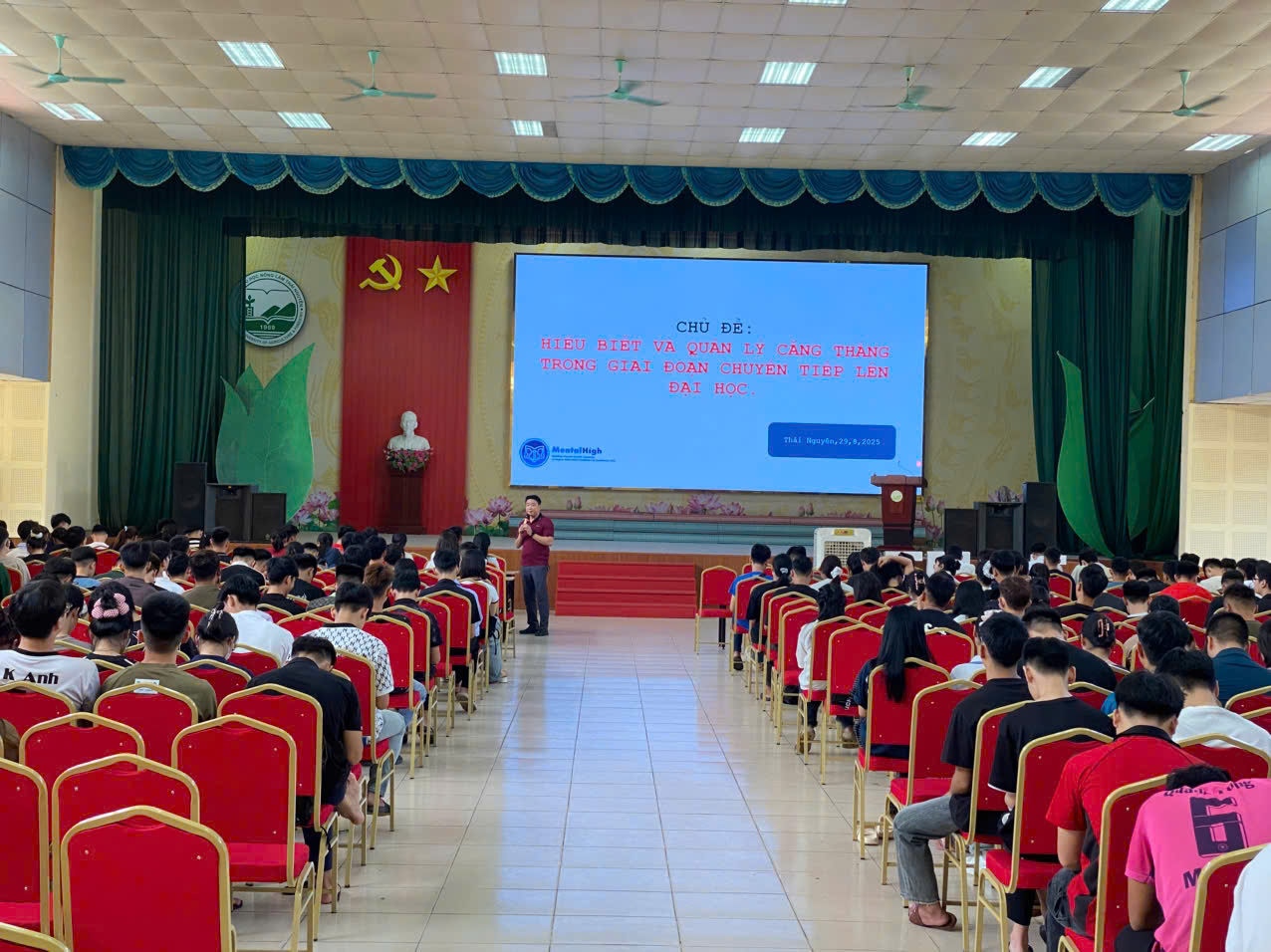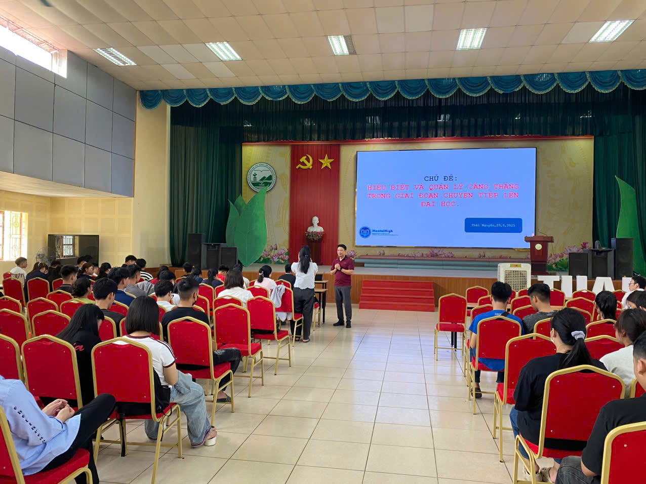 During the orientation week for new students at Thai Nguyen University of Agriculture and Forestry (TUAF), the university integrated mental health content to support students in adapting to the new academic environment. Specifically, the topic “Understanding and Managing Stress During the Transition to University” was incorporated into discussions and exchanges to help students acclimate and equip them with effective stress management skills. At the sharing session, the project management team, in collaboration with the Student Affairs Office, introduced the Mental Health Project, utilizing a mobile application alongside interactive activities such as group discussions and games. These activities were designed to enhance students’ awareness and responsibility toward their mental well-being, while providing practical tools to cope with pressures during the transition period. The program not only fostered a deeper understanding of stress but also encouraged students to develop self-care habits, contributing to their holistic development throughout their academic journey at the university.
