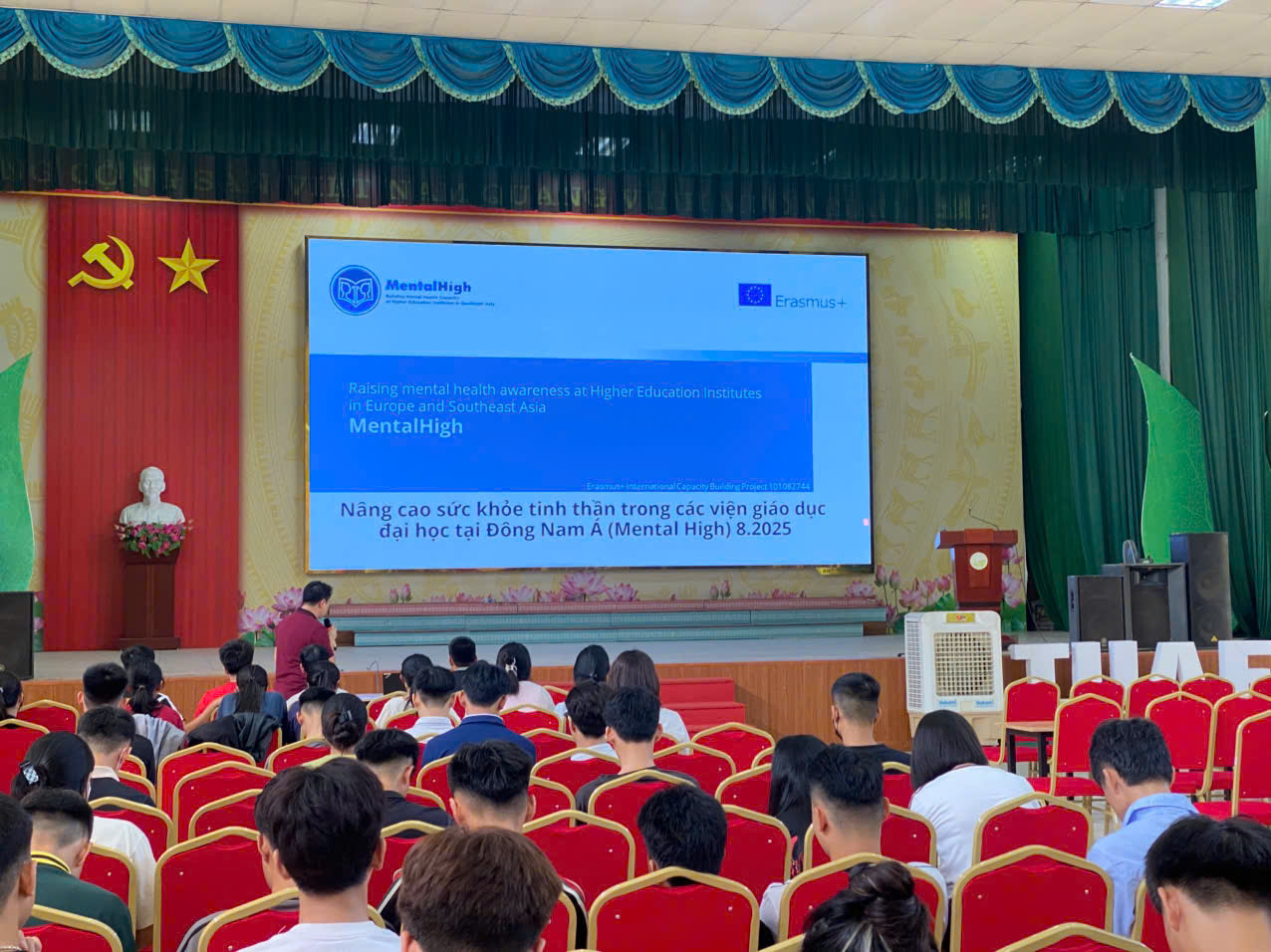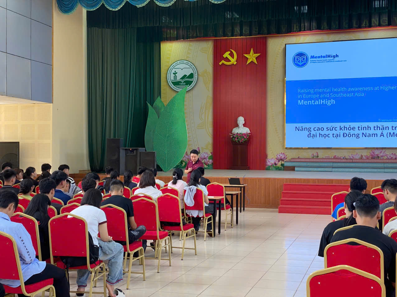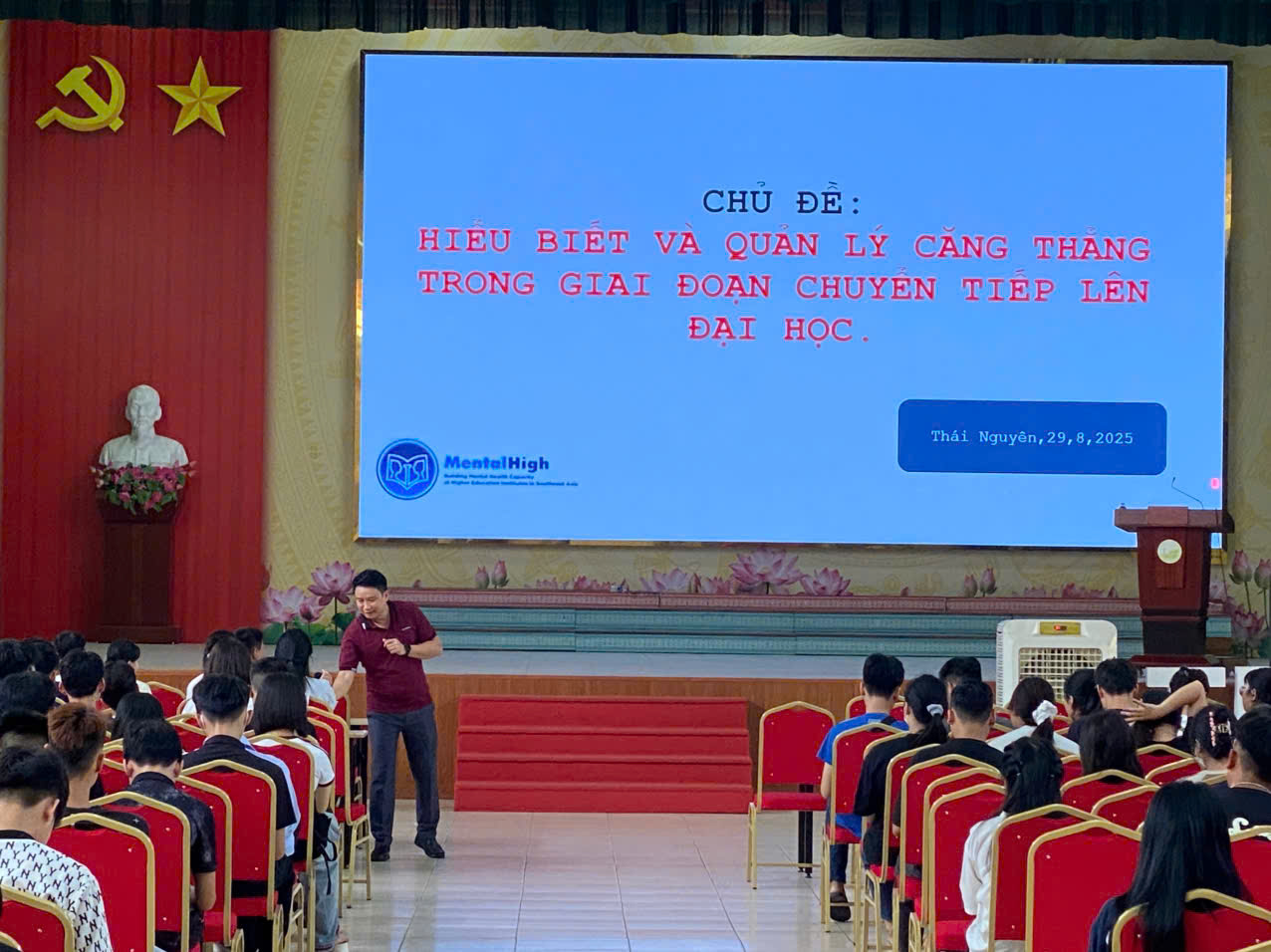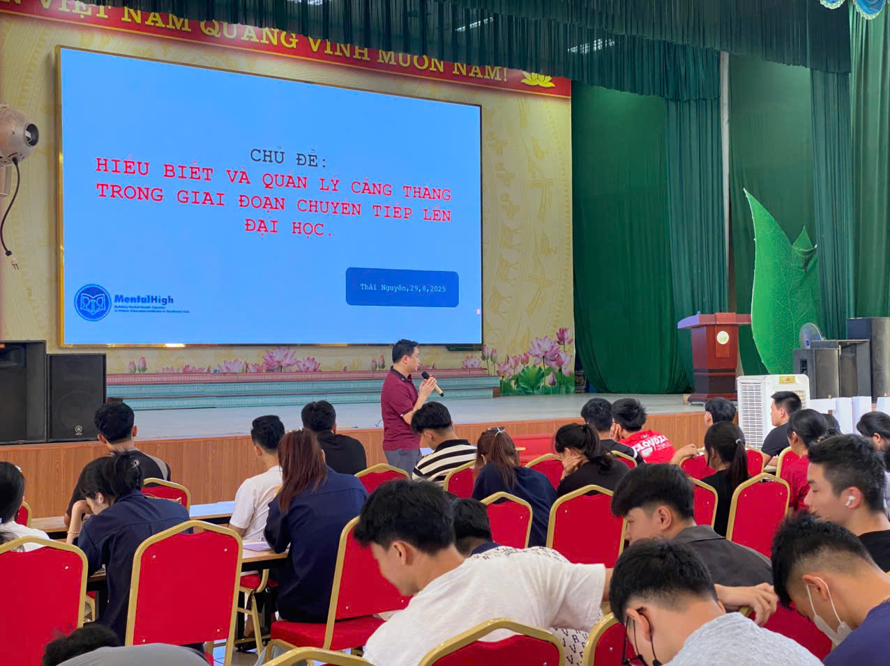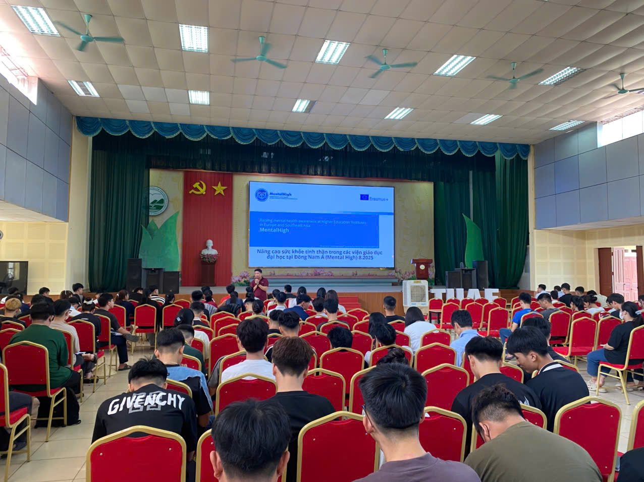 During the orientation week for new students at Thai Nguyen University of Agriculture and Forestry (TUAF), the university integrated mental health content to support students in adapting to the new academic environment. Specifically, the topic “Understanding and Managing Stress During the Transition to University” was incorporated into discussions and exchanges to help students acclimate and equip them with effective stress management skills. At the sharing session, the project management team, in collaboration with the Student Affairs Office, introduced the Mental Health Project, utilizing a mobile application alongside interactive activities such as group discussions and games. These activities were designed to enhance students’ awareness and responsibility toward their mental well-being, while providing practical tools to cope with pressures during the transition period. The program not only fostered a deeper understanding of stress but also encouraged students to develop self-care habits, contributing to their holistic development throughout their academic journey at the university.
