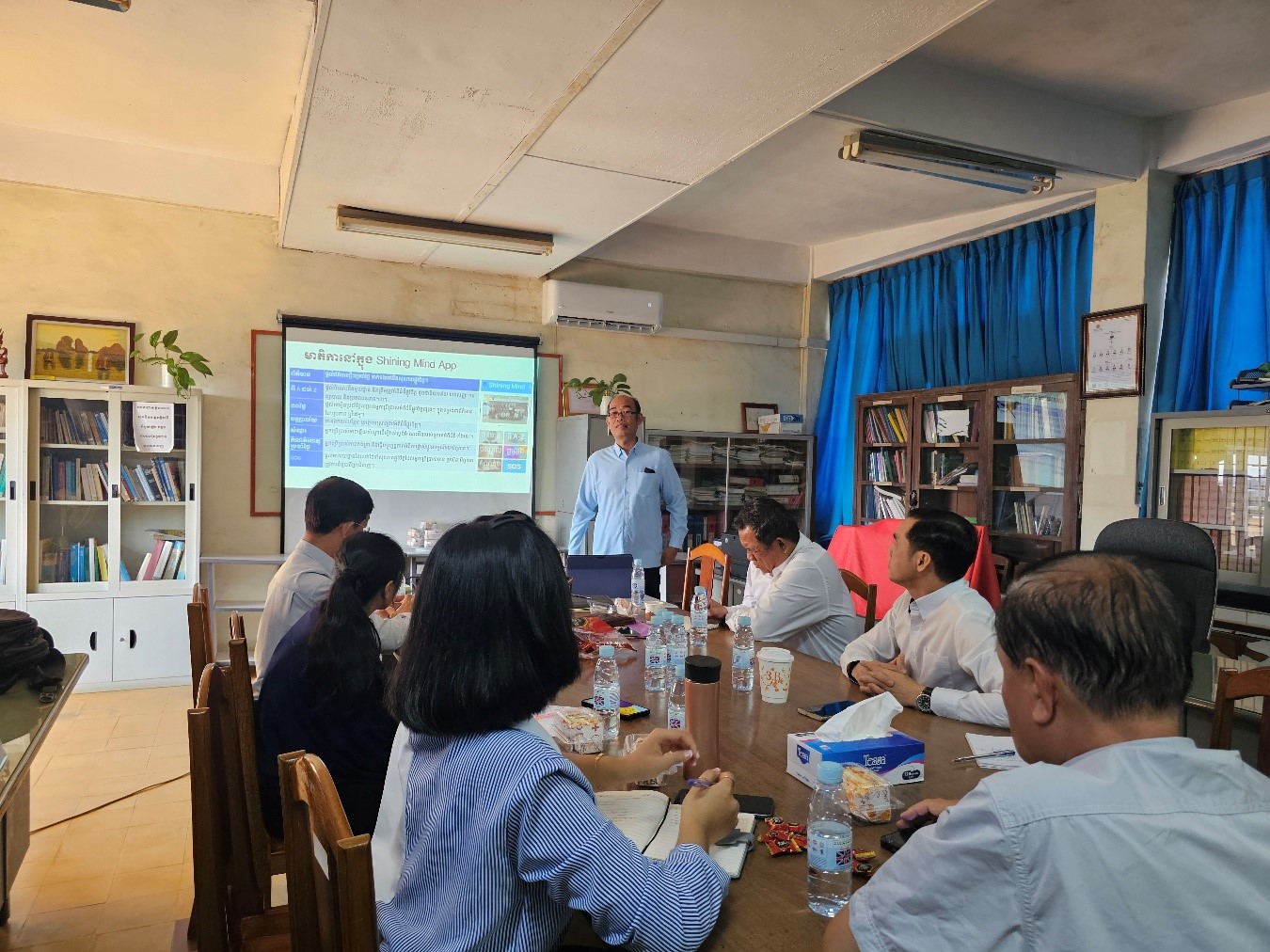 The CBW was organized at Royal University of Phnom Penh, with the participation of 8 professors and staffs. The aim of the workshop was to introduce the participants to the “MentalHigh Project” and the “Digital Platform” which includes MoodCare and ShiningMind app and how to manage stress at work places.